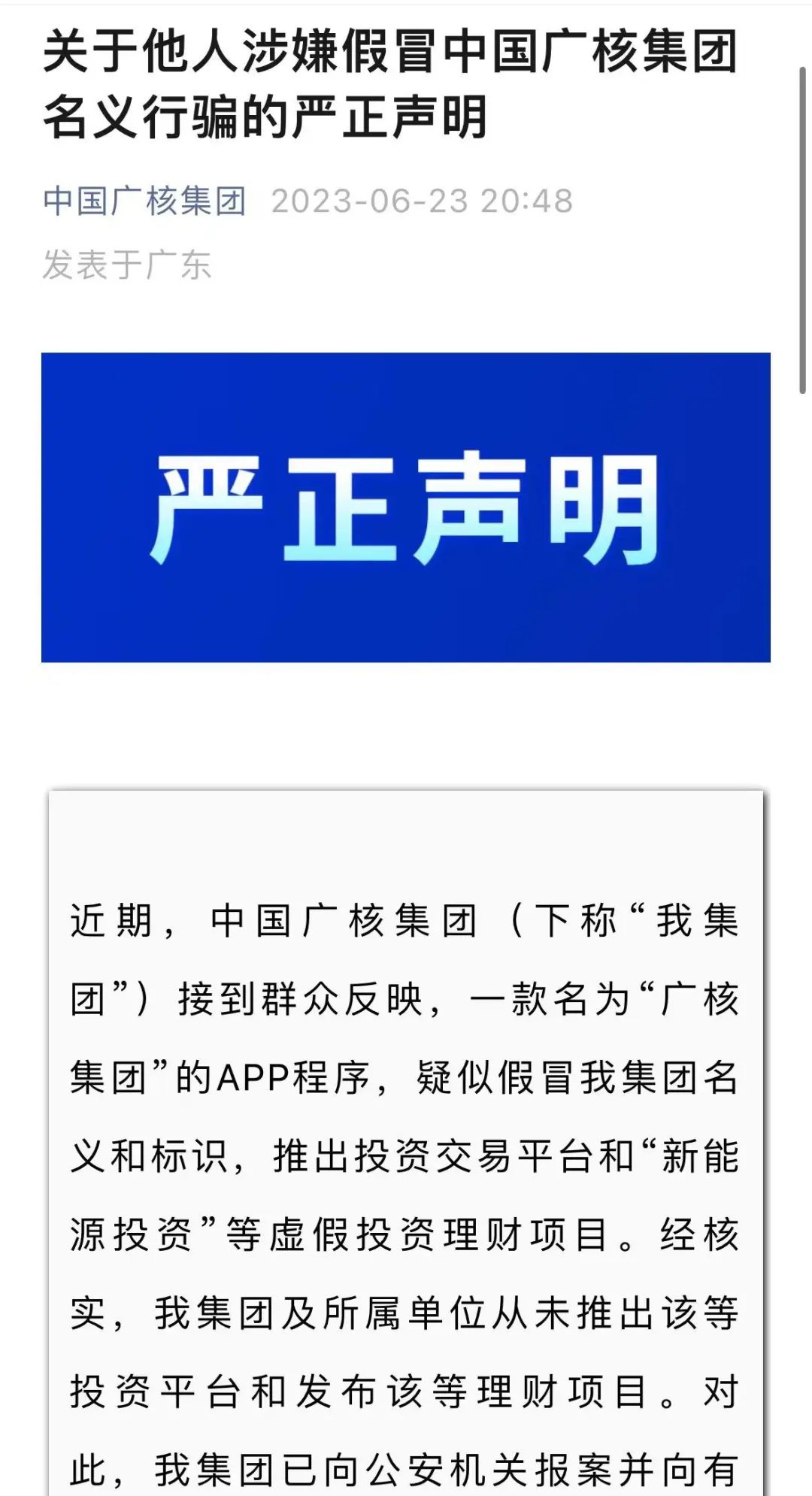 假冒中國廣核集團(tuán)名義行騙的嚴(yán)正聲明