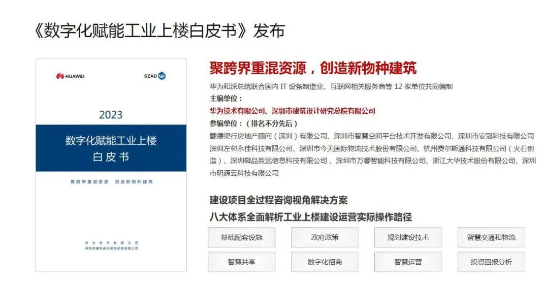 9月20日下午,華為全聯(lián)接大會(huì)“數(shù)智賦能”專題演講環(huán)節(jié),今天國(guó)際(300532)參編的《2023數(shù)字化賦能工業(yè)上樓白皮書(shū)》(以下簡(jiǎn)稱“白皮書(shū)”)正式發(fā)布。本白皮書(shū)由華為技術(shù)有限公司和深圳市建筑設(shè)計(jì)研究總院有限公司聯(lián)合今天國(guó)際等多家 單位共同完成,今天國(guó)際作為主要參編單位,負(fù)責(zé)智慧交通解決方案和智慧物流解決方案章節(jié)內(nèi)容的編寫(xiě)。本白皮書(shū)重點(diǎn)圍繞產(chǎn)業(yè)空間日趨緊張的超大型城市工業(yè)發(fā)展需求,提供“工業(yè)上樓”的新思路和新方案,打造城市工業(yè)化再升級(jí)的新物種。