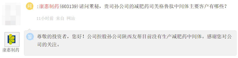 其實(shí),在當(dāng)天的交易時間內(nèi),投資者互動平臺上就有多位投資者都在追問康惠制藥司美格魯肽中間體的更多細(xì)節(jié)問題。對此,康惠制藥改口表示,陜西友幫目前沒有生產(chǎn)減肥藥中間體。