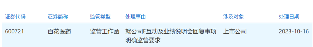 同日晚,上交所也向百花醫(yī)藥下發(fā)監(jiān)管工作函,處理事由為:就公司E互動及業(yè)績說明會回復(fù)事項(xiàng)明確監(jiān)管要求。