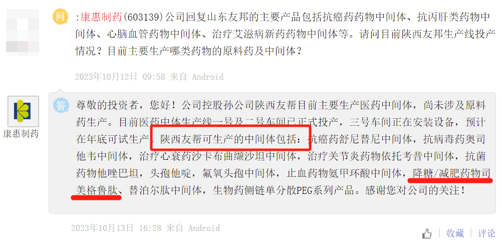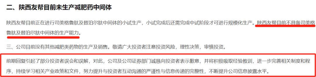 公司表示,其控股孫公司陜西友幫目前不具備司美格魯肽及替泊爾肽中間體的生產(chǎn)能力。