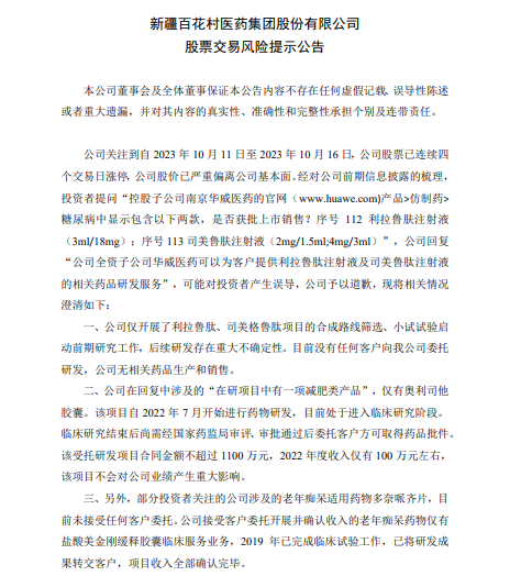 此外,10月11日至10月16日,百花醫(yī)藥(600721)已連續(xù)四個交易日漲停。16日晚,百花醫(yī)藥發(fā)布股票交易風(fēng)險提示公告,稱公司在回復(fù)投資者的提問時表示,“公司全資子公司華威醫(yī)藥可以為客戶提供利拉魯肽注射液及司美魯肽注射液的相關(guān)藥品研發(fā)服務(wù)”,可能對投資者產(chǎn)生誤導(dǎo),公司予以道歉。