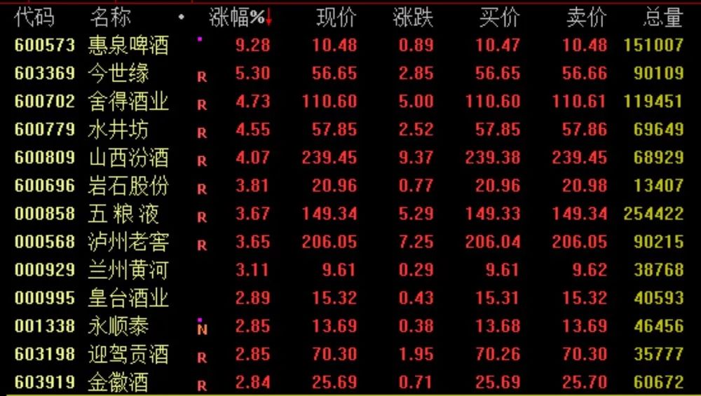 酒類股今日反彈走高,截至收盤,惠泉啤酒漲約9%,今世緣(603369)漲超5%,舍得酒業(yè)、水井坊、山西汾酒等漲超4%,五糧液(000858)漲超3%,貴州茅臺(tái)(600519)漲超2%。