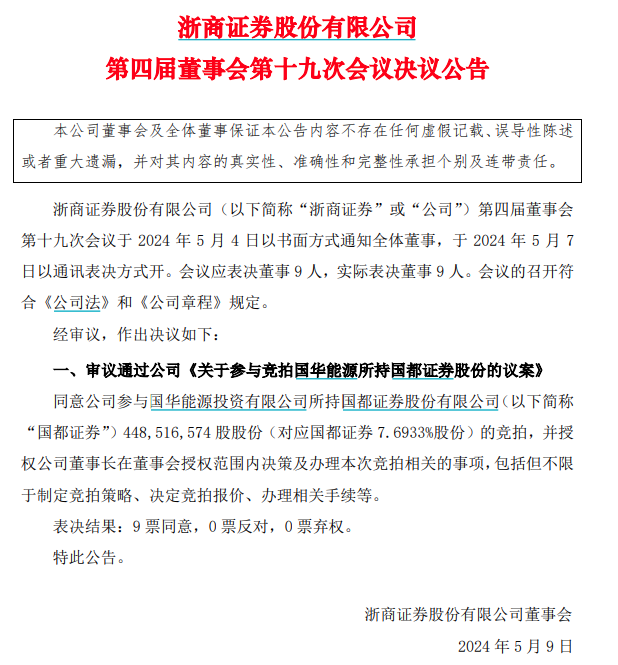 5月7日,浙商證券董事會審議通過《關于參與競拍國華能源所持國都證券股份的議案》,同意公司參與國華能源投資有限公司所持國都證券448,516,574股股份(對應國都證券7.6933%股份)的競拍,并授權公司董事長在董事會授權范圍內(nèi)決策及辦理本次競拍相關的事項,包括但不限于制定競拍策略、決定競拍報價、辦理相關手續(xù)等。