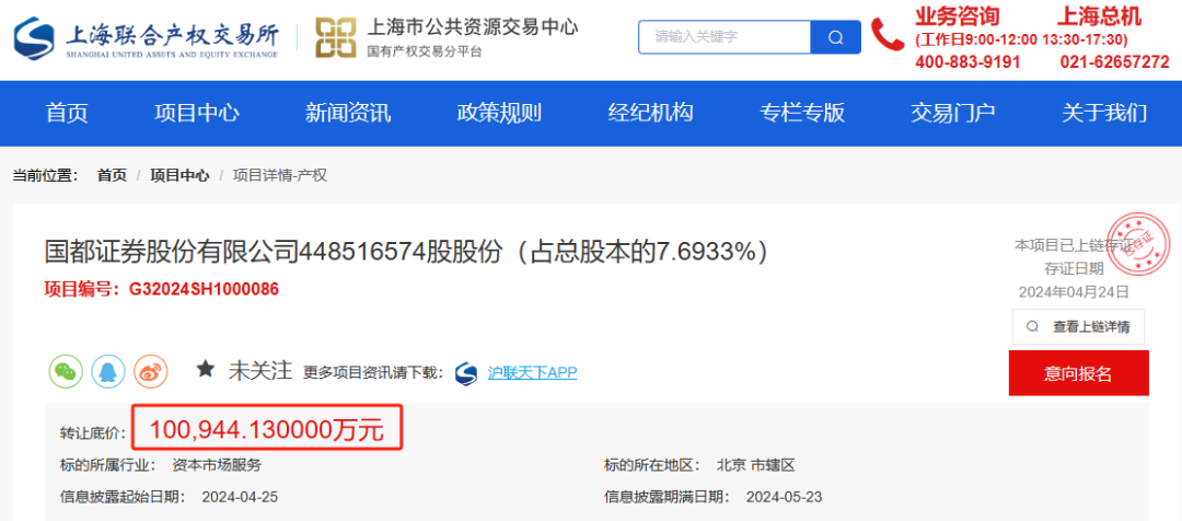 近期,國都證券第三大股東國華能源投資有限公司在上海聯(lián)合產(chǎn)權交易所掛牌轉讓所持國都證券全部股份,即此次浙商證券提及參拍的4.485億股。根據(jù)掛牌信息,此次轉讓的底價超10億元。