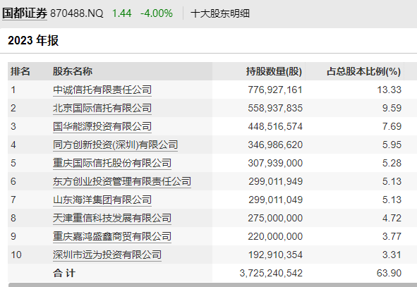 國都證券2023年年報顯示,其第一大股東為中誠信托,持股比例為13.33%。中誠信托第二大股東國家能源集團資本控股有限公司,與國華能源投資有限公司同為國家能源投資集團的全資子公司。