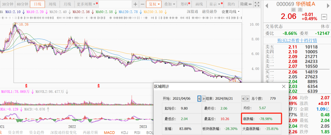 在股價方面,華僑城A近年來整體下行,目前正值階段性低位。公開數(shù)據(jù)顯示,從2021年4月6日至2024年6月21日,華僑城A股價累計(jì)跌幅達(dá)78.98%。