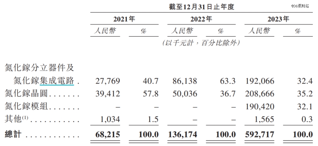 產(chǎn)品構(gòu)成方面,2023年英諾賽科晶圓、分立器件+集成電路、模組的營(yíng)業(yè)收入分別為2.09、1.92、1.90億元,三個(gè)產(chǎn)品的營(yíng)收分布比較均衡。值得注意的是,2022年及以前,英諾賽科并沒有模組收入,2023年公司模組收入激增則是因?yàn)橄驅(qū)幍聲r(shí)代供貨。