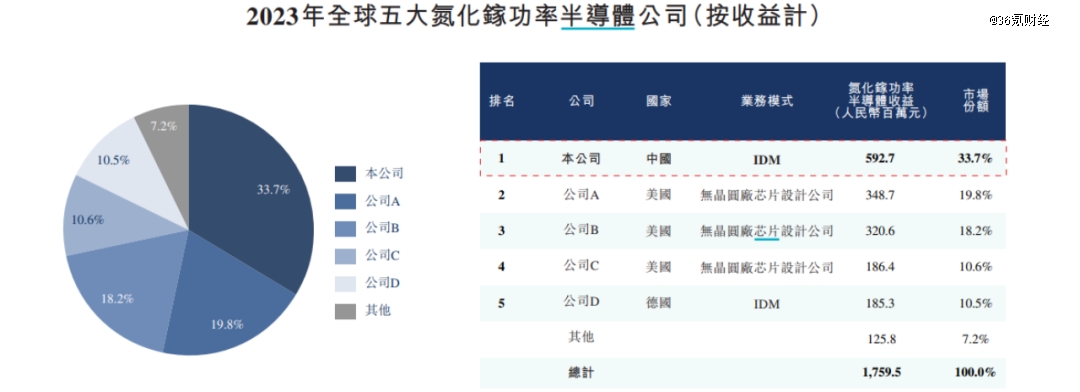 2021—2023年,英諾賽科的營(yíng)業(yè)收入分別為0.68億元、1.36億元和5.93億元,根據(jù)英諾賽科招股說明書披露,按營(yíng)收口徑,英諾賽科2023年在氮化鎵功率半導(dǎo)體的市場(chǎng)份額約為33.7%,前五大市場(chǎng)份額合計(jì)92.8%。按氮化鎵分立器件數(shù)量折算,英諾賽科2023年以來累計(jì)出貨量超5億顆,市占率42.4%。