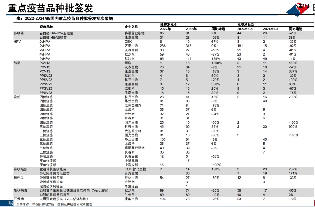 據(jù)美銀美林?jǐn)?shù)據(jù),2024年上半年NMPA共批準(zhǔn)97批HPV疫苗批簽發(fā),同比減少72.4%;其中,9價(jià)/4價(jià)/2價(jià)HPV疫苗批簽發(fā)量分別為62/2/33批,2023年同期為65/26/261批。而從廠商角度,萬泰/智飛(默沙東)/沃森/GSK的批簽發(fā)量分別為25/64/6/2批,同比分別下降89.3%/29.7%/73.9%/50.0%。