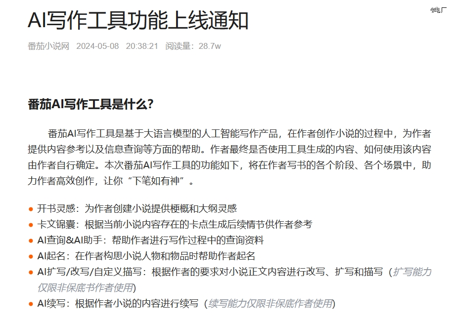 在作者的抗議與輿論的風(fēng)波之下,番茄小說上線了相關(guān)條款的功能入口,并發(fā)布了關(guān)于AI輔助寫作條款的補(bǔ)充說明,稱初衷是為了“開發(fā)能夠幫助作者大幅提升寫作效率與閱讀體驗(yàn)的輔助工具”?!胺压俜?jīng)]有發(fā)布過任何純AI寫作的作品,也不會(huì)違背作者個(gè)人意愿使用AI寫作能力。我們相信人的價(jià)值,尊重并展現(xiàn)所有創(chuàng)作者的才華和夢想。AI始終只是輔助創(chuàng)作者實(shí)現(xiàn)夢想的一個(gè)創(chuàng)作工具?!?/p>