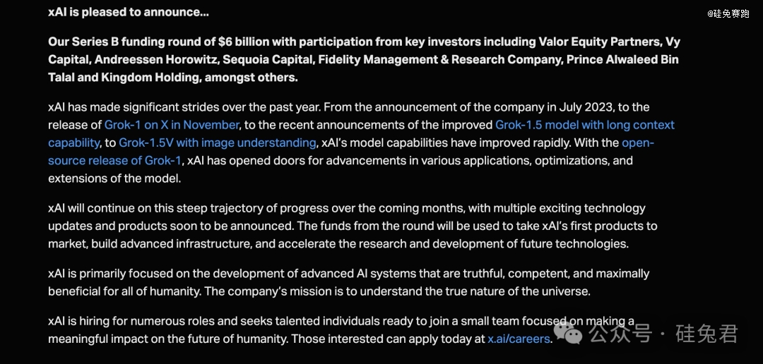 今年5月,埃隆·馬斯克官宣xAI獲得60億美元的B輪融資。本輪融資的主要投資者包括美國風投公司Valor Equity Partners、迪拜“神秘”投資公司Vy Capital、硅谷知名風投機構(gòu)Andreessen Horowitz、紅杉資本、富達管理公司和沙特王國控股公司(Kingdom Holding)等。
