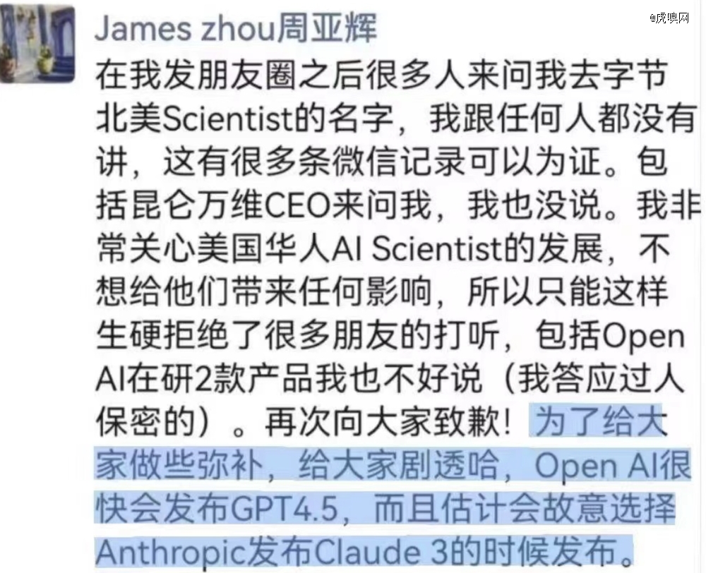 疑似周亞輝在朋友圈透漏 GPT4.5 發(fā)布時間