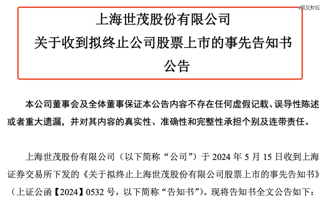 近日,世茂股份公告稱(chēng),公司收到上交所下發(fā)的《關(guān)于擬終止上海世茂股份有限公司股票上市的事先告知書(shū)》。