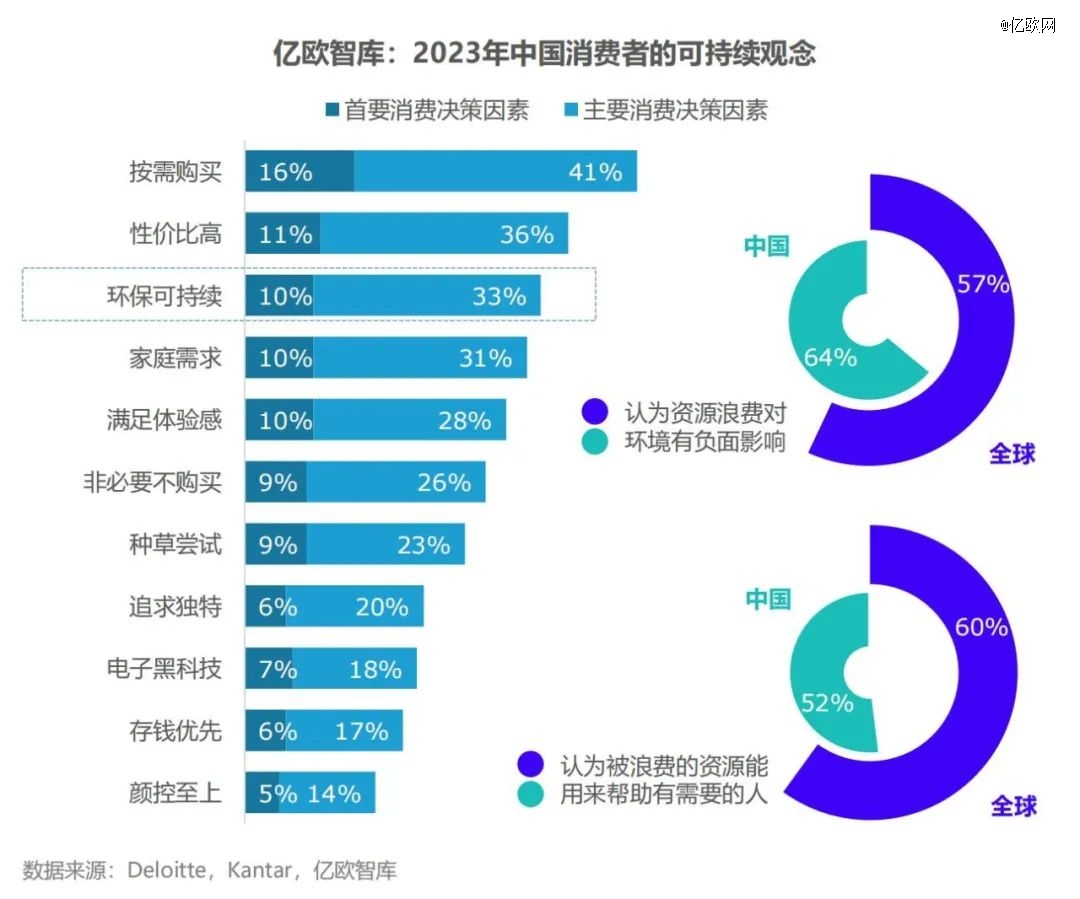 億歐智庫調(diào)研發(fā)現(xiàn),2023年,“環(huán)??沙掷m(xù)”成為消費者們的主要消費決策因素之一。進入理性消費的時代,消費者在購買行為中獲得安全感的需求遠高于沖動消費時產(chǎn)生的多巴胺??沙掷m(xù)消費所體現(xiàn)的對于安穩(wěn)、安全、長遠、美好的追求是對消費者社會情感訴求的反射。