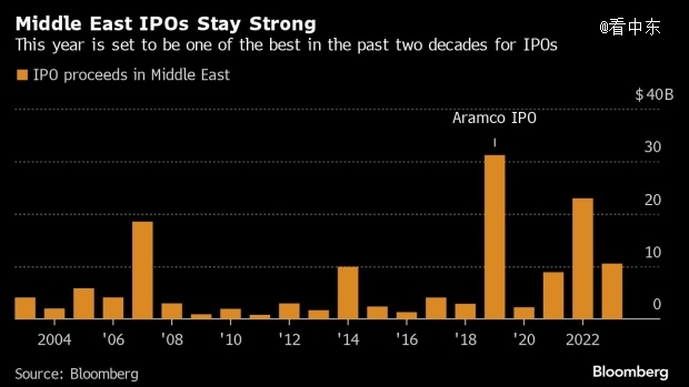 過去兩年,這個(gè)能源豐富的地區(qū)已成為繁忙的IPO市場(chǎng),因?yàn)楦鲊蛩阍谠蛢r(jià)格居高不下的情況下出售其國有企業(yè)的股份,以擺脫對(duì)石油的依賴。盡管融資額低于去年,但 105 億美元的 IPO 收益已經(jīng)創(chuàng)下了第三高的年份。2023年,海灣地區(qū)已經(jīng)占領(lǐng)了歐洲、中東和非洲 IPO 總量的 45%。