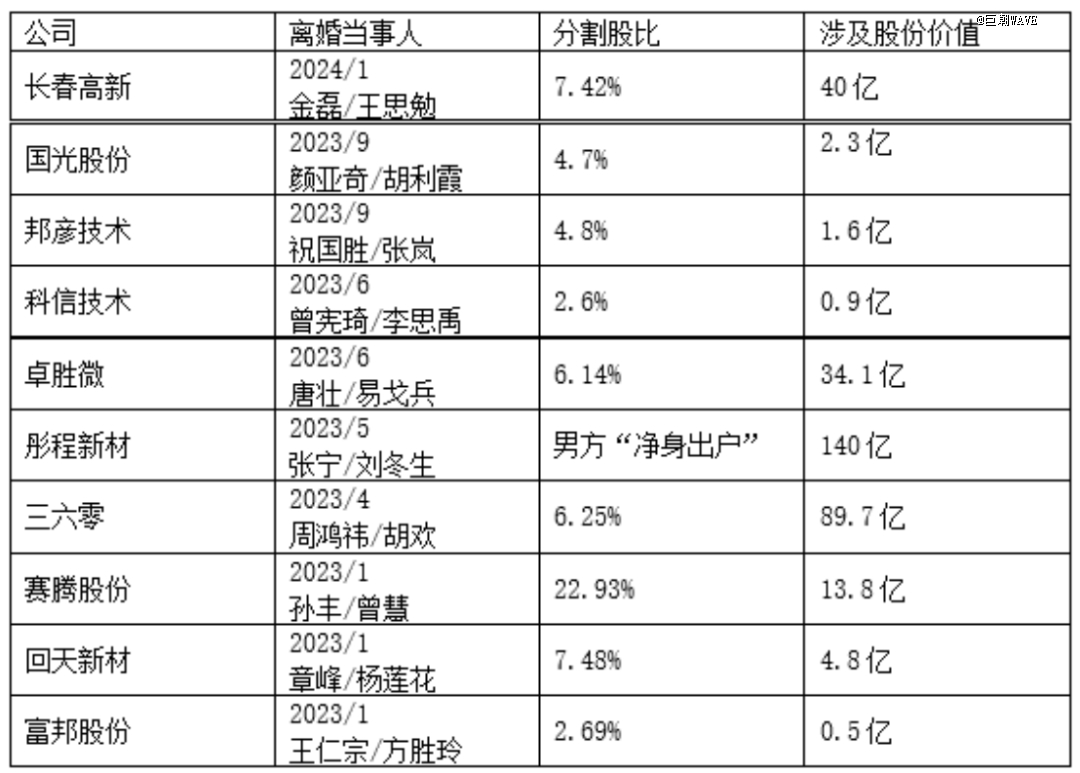 去年以來,上市公司大股東鬧離婚、分割巨額財(cái)產(chǎn)的事情真不算少,有彤程新材這樣公司控制權(quán)直接易主的,有賽騰股份這樣離婚夫妻股份平分、誰也不服誰的,還有360這樣不影響控制權(quán),但會(huì)影響股價(jià)的。
