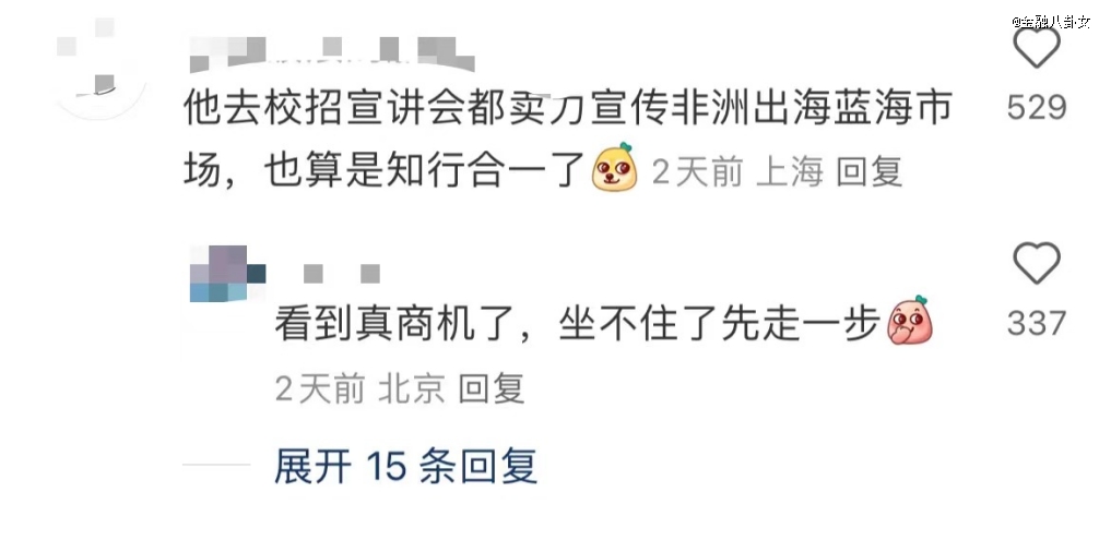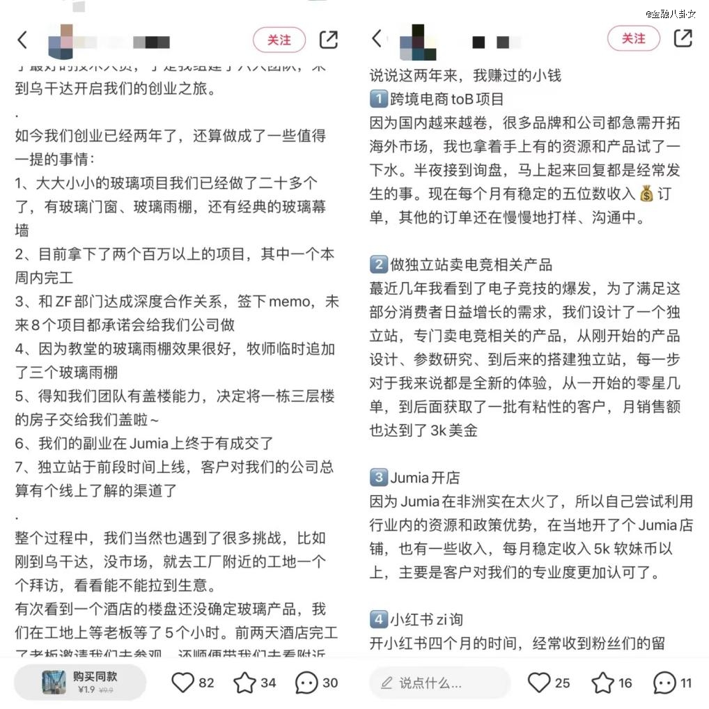 如今,這位博主已經(jīng)去非洲創(chuàng)業(yè)兩年了,她還公開了一些自己的“生財(cái)之道”,除了一些當(dāng)?shù)氐拇箜?xiàng)目,也賺過一些小錢~
