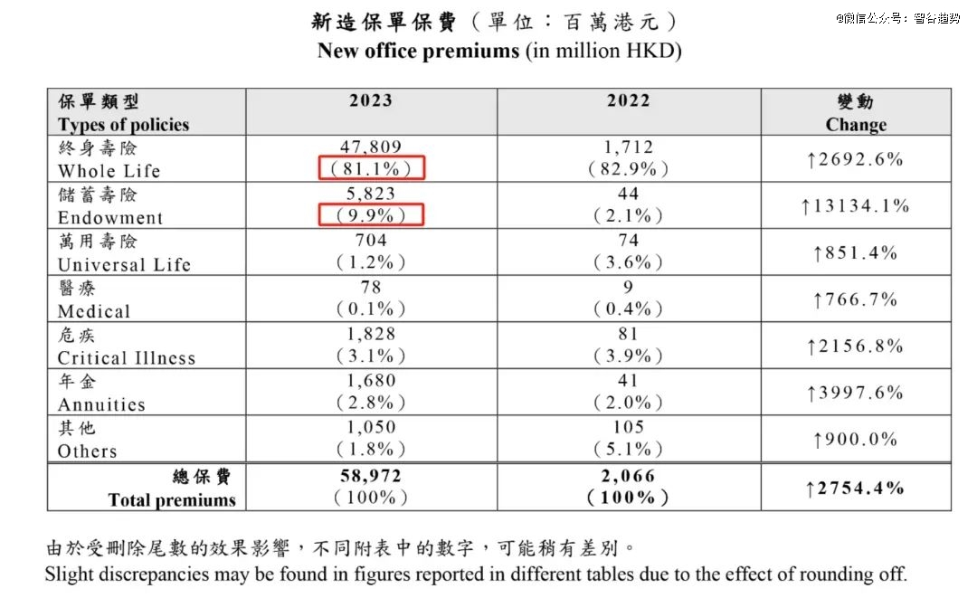 據(jù)香港保監(jiān)局統(tǒng)計,2023年來自內(nèi)地的新單總保費590億港幣,90%配置了儲蓄型保險(包括終身壽險和儲蓄壽險)。