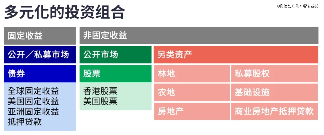 下圖選取了某家香港保險公司的投資圖,也是多元化的投資組合,投資范圍遍布全球各大洲,產(chǎn)品包括了海外股票、債券在內(nèi)的類別,連普通人難以觸及的林地、農(nóng)地項目都有涉獵。