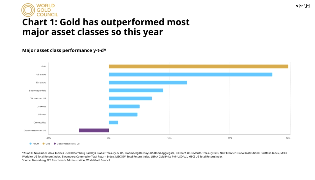 近年來,隨著多國央行頻頻出手增持黃金,國際金價(jià)一路上行,屢創(chuàng)新高。截至2024年年底,倫敦現(xiàn)貨黃金定盤價(jià)為2609.1美元/盎司,較年初的2074.90美元/盎司上漲25.75%,其收益表現(xiàn)優(yōu)于美國股票、新興市場股票等其他主要資產(chǎn)。與此同時(shí),各類黃金衍生品交易規(guī)模持續(xù)放大,黃金儼然成為了過去一年中全球表現(xiàn)*的資產(chǎn)種類。
