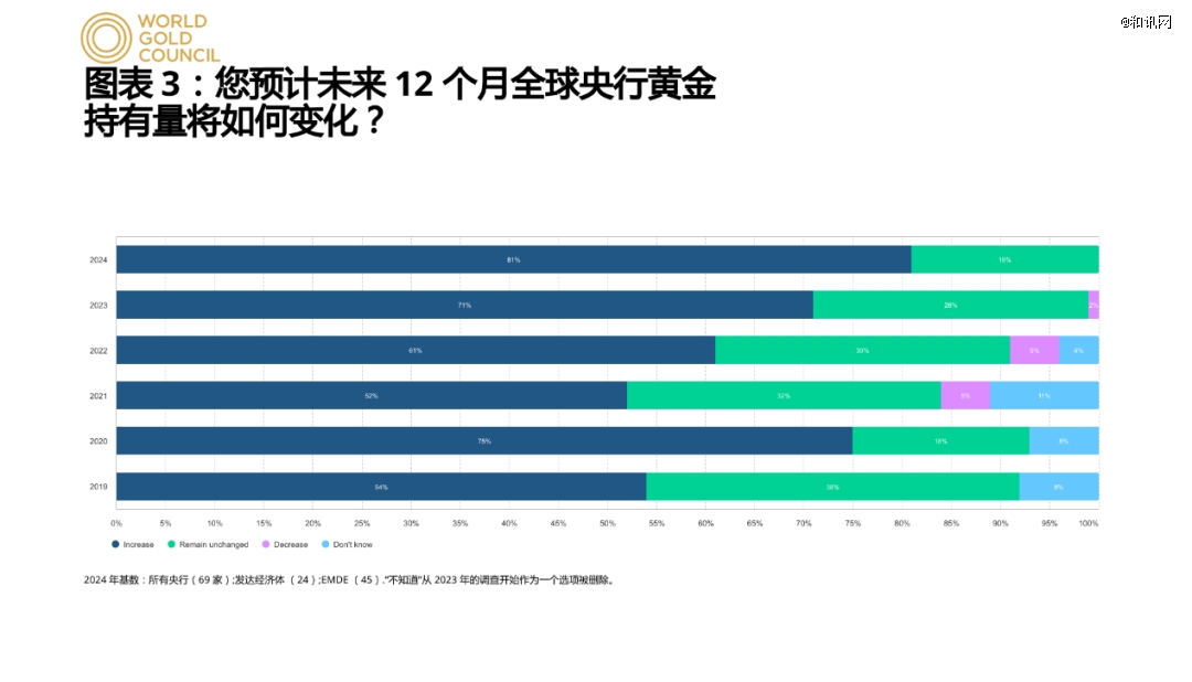 對(duì)于未來央行能否保持增持黃金的熱情,世界黃金協(xié)會(huì)在2024年央行黃金儲(chǔ)備調(diào)查報(bào)告中指出,通過梳理70份有效調(diào)查回復(fù),有29%的央行受訪者計(jì)劃在未來12個(gè)月內(nèi)增加黃金儲(chǔ)備,而這一比例是2018年開始此項(xiàng)調(diào)查以來的最高水平。同時(shí)這份報(bào)告還指出,有81%的央行受訪者認(rèn)為未來12個(gè)月全球各國央行黃金持有量將進(jìn)一步增加。