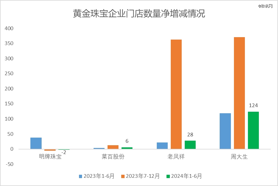 從黃金珠寶上市企業(yè)的財(cái)報(bào)獲悉,截至2024年6月末,菜百股份擁有93 家直營連鎖門店,較年初凈增加6家,增加數(shù)量不及2023年下半年的13家,而同期老鳳祥的銷售網(wǎng)點(diǎn)增加了28家,與2023年下半年的363家相差甚遠(yuǎn)。此外,明牌珠寶的門店數(shù)量在去年上半年凈減少了2家。