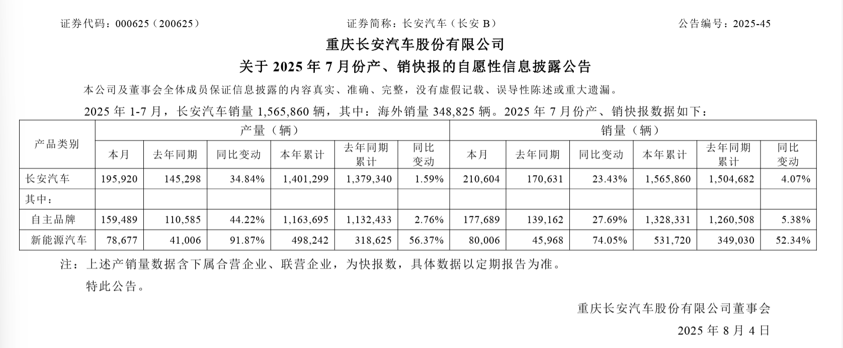 近日,重慶長安汽車(000625)股份有限公司(長安汽車(000625.SZ))發(fā)布2025年7月份產(chǎn)銷快報顯示,7月份,長安汽車銷量21.06萬輛,同比增長23.43%;2025年1-7月,長安汽車銷量為156.59萬輛,同比增長4.07%,其中海外銷量34.88萬輛。
