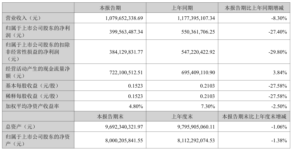 從公司上半年的營(yíng)收、利潤(rùn)情況看,財(cái)報(bào)顯示,今年上半年,公司營(yíng)業(yè)收入10.8億元,同比下降8.30%;歸母凈利潤(rùn)4億元,同比下降27.4%;扣非凈利潤(rùn)3.84億元,同比下降29.8%;截至報(bào)告期末,公司總資產(chǎn)為96.92億元,同比下滑-1.06%。