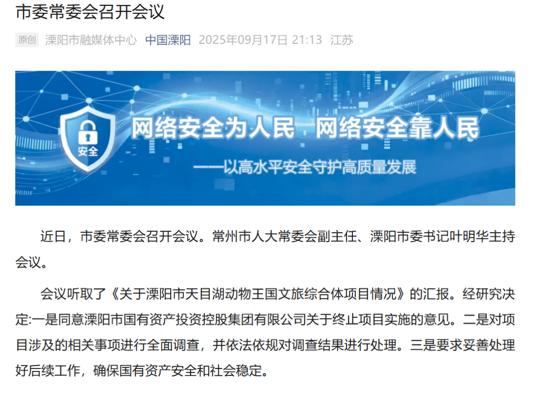 會議聽取了《關于溧陽市天目湖動物王國文旅綜合體項目情況》的匯報。經研究決定:一是同意溧陽市國有資產投資控股集團有限公司關于終止項目實施的意見。二是對項目涉及的相關事項進行全面調查,并依法依規(guī)對調查結果進行處理。三是要求妥善處理好后續(xù)工作,確保國有資產安全和社會穩(wěn)定。