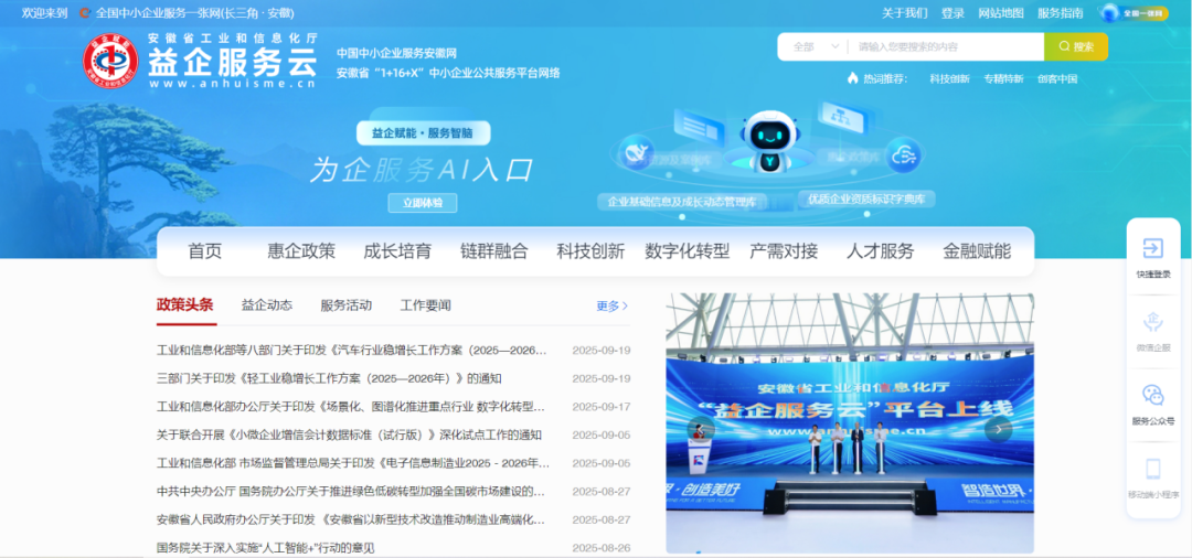9月20日下午,由安徽省工業(yè)和信息化廳主辦,安徽省工信廳中小企業(yè)發(fā)展促進中心承辦的2025世界制造業(yè)大會首場發(fā)布活動——科大國創(chuàng)承建的“益企服務云”平臺(以下簡稱“平臺”)上線發(fā)布儀式圓滿舉行,工業(yè)和信息化部中小企業(yè)局、中國中小企業(yè)發(fā)展促進中心、安徽省工業(yè)和信息化廳、中國中小企業(yè)服務網(wǎng)等相關領導共同參與平臺啟動環(huán)節(jié)。