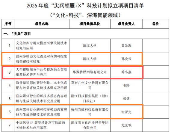 近日,浙江省科技廳發(fā)布了2026年度“尖兵領(lǐng)雁+X”科技計劃擬立項項目清單(“文化+科技”、深海智能領(lǐng)域)。其中由華數(shù)傳媒(000156)網(wǎng)絡(luò)有限公司首次牽頭承擔(dān)的“大型視聽服務(wù)平臺多模態(tài)融合智能推薦技術(shù)研究與應(yīng)用”成功入選“尖兵”項目清單。同時,華數(shù)作為重要參與單位的2個“尖兵”項目也成功入選,分別是“面向多模態(tài)文化語義對齊的可控生成關(guān)鍵技術(shù)研究”和“面向媒體行業(yè)的可控多模態(tài)內(nèi)容理解與生成關(guān)鍵技術(shù)研究及應(yīng)用”。