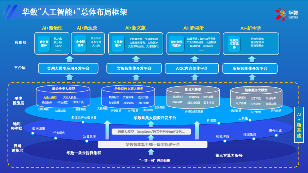 華數(shù)此次成功牽頭和參與以上多項“尖兵”項目,其核心基礎(chǔ)在于前瞻性地在“人工智能+”與“視聽+文旅”領(lǐng)域進行了戰(zhàn)略布局、技術(shù)攻關(guān)與實踐積累。近年來,華數(shù)始終堅持“文化+科技”的融合發(fā)展路徑,將實施“人工智能+”戰(zhàn)略作為驅(qū)動企業(yè)轉(zhuǎn)型升級的關(guān)鍵抓手,全面推進數(shù)智化發(fā)展,取得了系列標(biāo)志性成果。